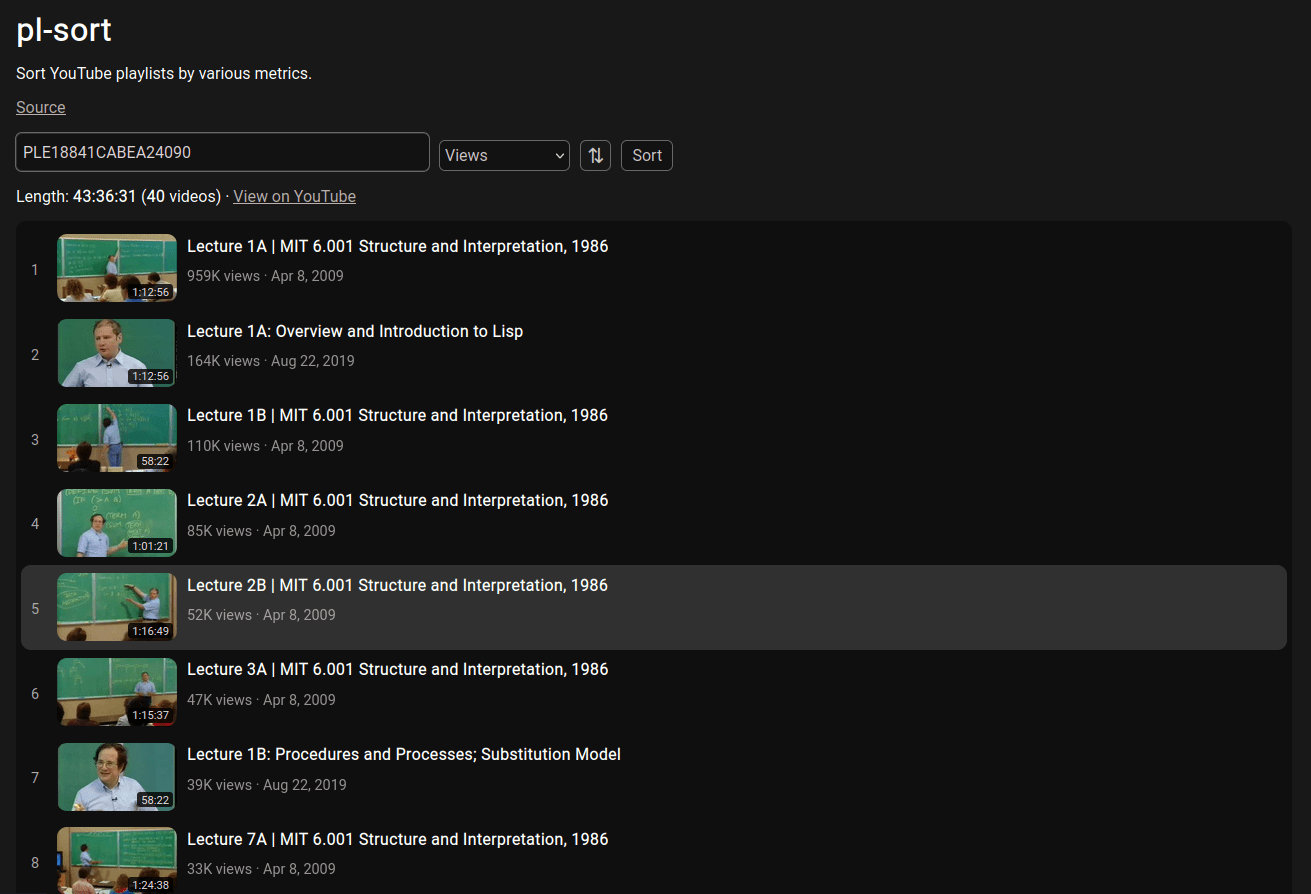 So, I made plsort. It allows you to enter a playlist link or id and sort it by views, duration of videos, like/dislike counts, title (alphabetically), date of publication, and of course, the default order.