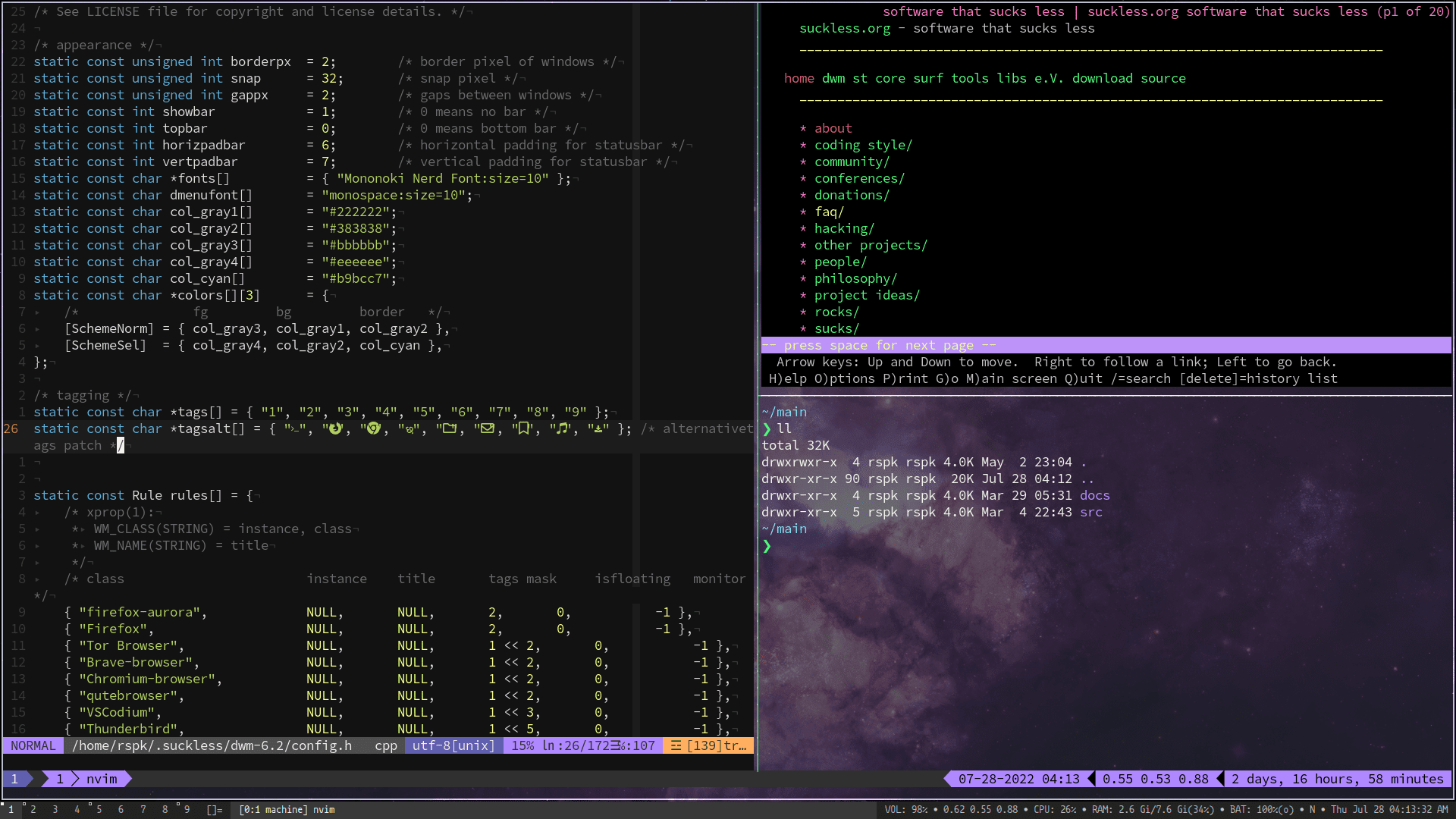 Eventually, I came across r/unixporn, Luke Smith, DistroTube, etc. I watched several i3wm and urxvt tutorials from Code Cast on YouTube. As a result, I was able to customize my computer to suit my preferences, resulting in a unique look. Additionally, I created a repository on Github to backup and store my dotfiles in case I ever decide to change my distro. I became another 'btw, I use Arch' guy, constantly configuring my system, and discovering new tools and open source software programs all the time, but I haven't yet revisited the C++ book. I anticipate resuming it in about a week or so but there is no denying that that seemingly stupid question has taught me so much.